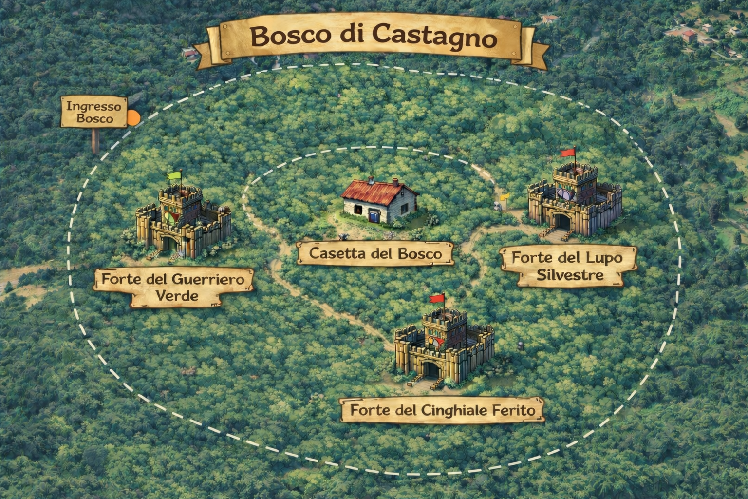 La nostra mappa evidenzia la struttura naturale e strategica del campo: un bosco di castagni di 6000 mq pensato per offrire azione continua e scelte tattiche reali. I tre fortini, posizionati in punti chiave, creano un equilibrio dinamico che permette ad ogni squadra di scegliere come impostare la partita: difendere, attaccare o manovrare lungo i percorsi naturali. I sentieri, le coperture naturali e i collegamenti tra le aree sono studiati per rendere ogni movimento decisivo e ogni partita diversa dalla precedente.
